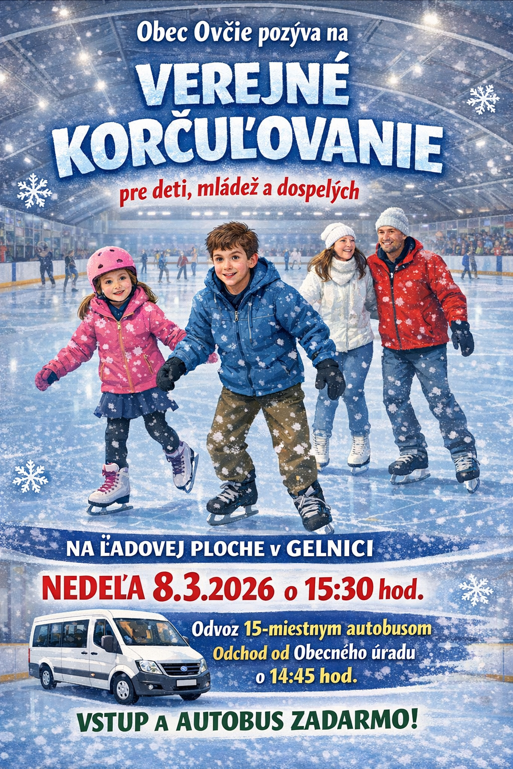 Obec Ovčie pozýva deti, mládež a dospelých na verejné korčuľovanie do Gelnice v nedeľu dňa 8.3.2026 o 15:30 hod. Odvoz je zabezpečený 15-miestnym autobusom s odchodom od OcÚ Ovčie o 14:45 hod. Vstup a autobus je zadarmo.