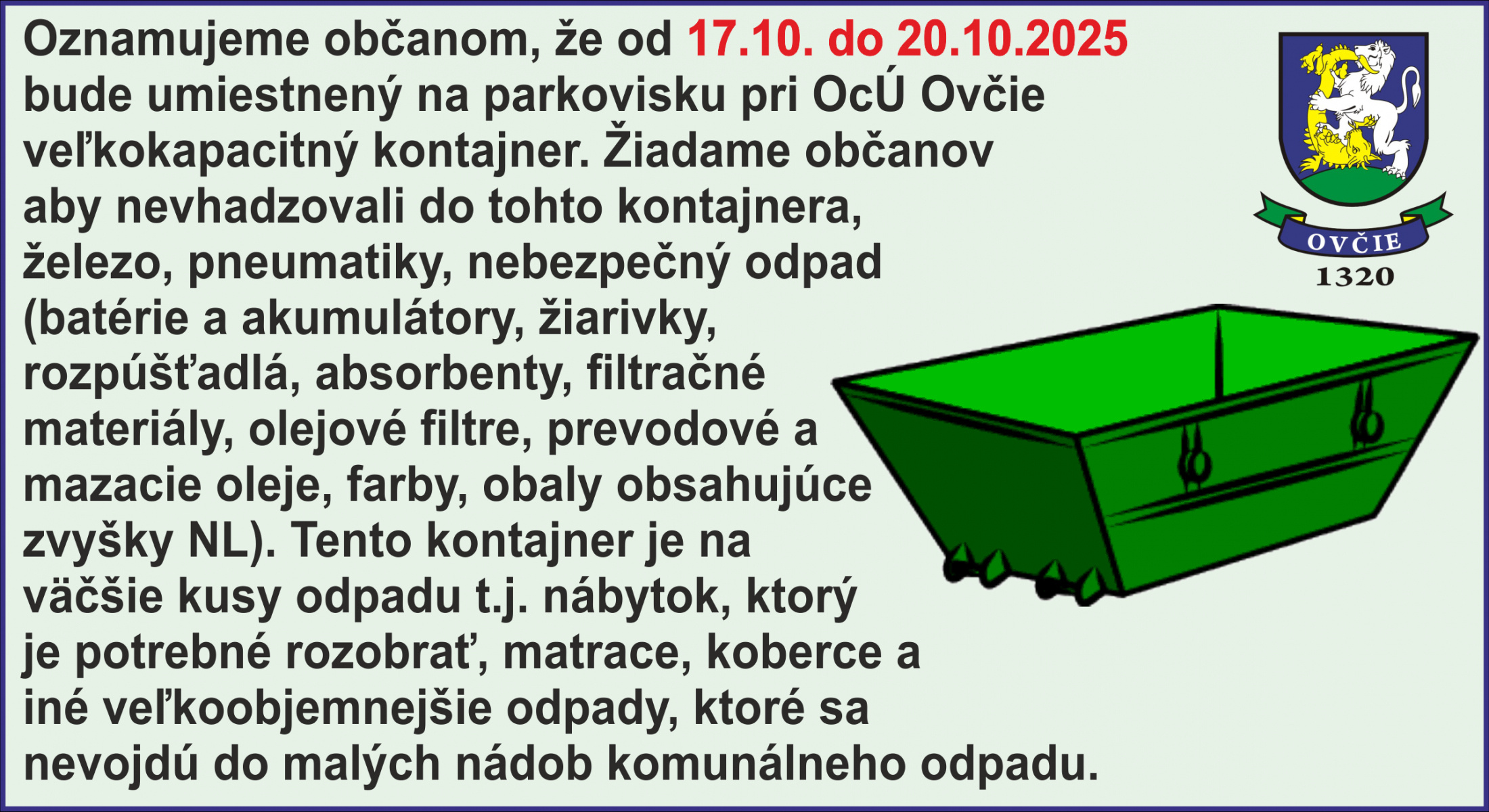 Oznamujeme občanom, že od 17.10. do 20.10.2025 bude umiestnený na parkovisku pri OcÚ Ovčie veľkokapacitný kontajner. Žiadame občanov aby nevhadzovali do tohto kontajnera, železo, pneumatiky, nebezpečný odpad (batérie a akumulátory, žiarivky, rozpúšťadlá, absorbenty, filtračné materiály, olejové filtre, prevodové a mazacie oleje, farby, obaly obsahujúce zvyšky NL). Tento kontajner je na väčšie kusy odpadu t.j. nábytok, ktorý je potrebné rozobrať, matrace, koberce a iné veľkoobjemnejšie odpady, ktoré sa nevojdú do malých nádob komunálneho odpadu.