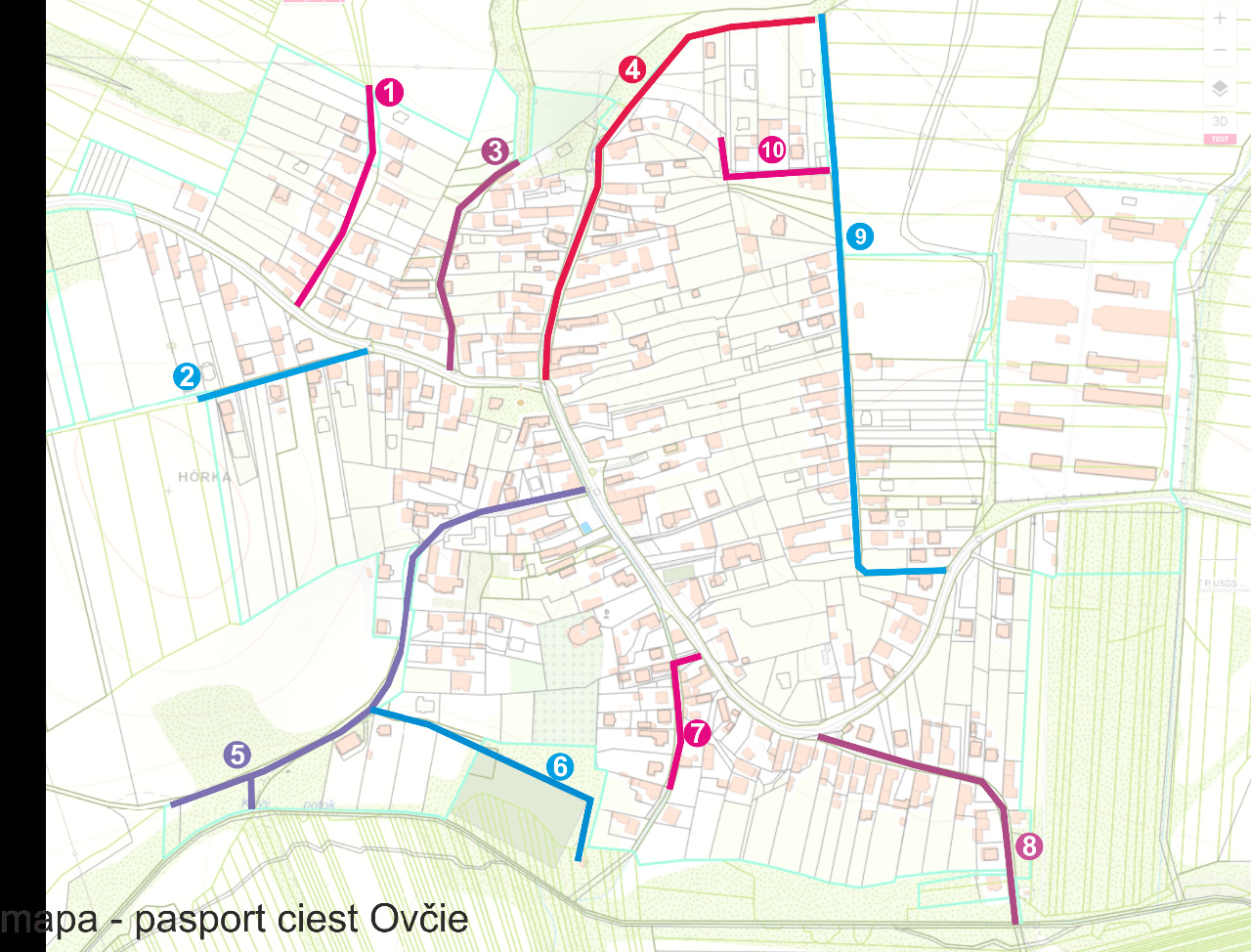 Mapa – Miestne komunikácie sú zakreslené do podkladu katastrálnej mapy. Farebne sú rozlíšené podľa legendy a očíslované. Farebné zobrazenie predstavuje ich skutočnú dĺžku v území.